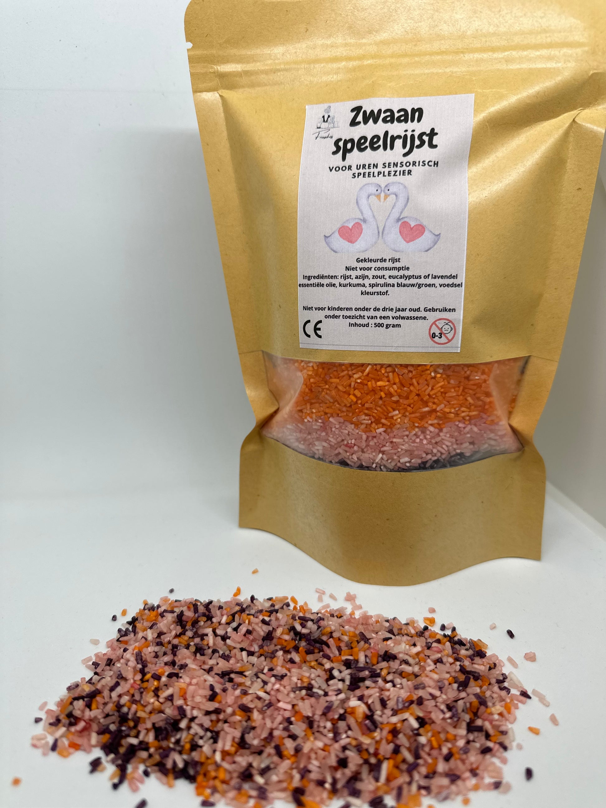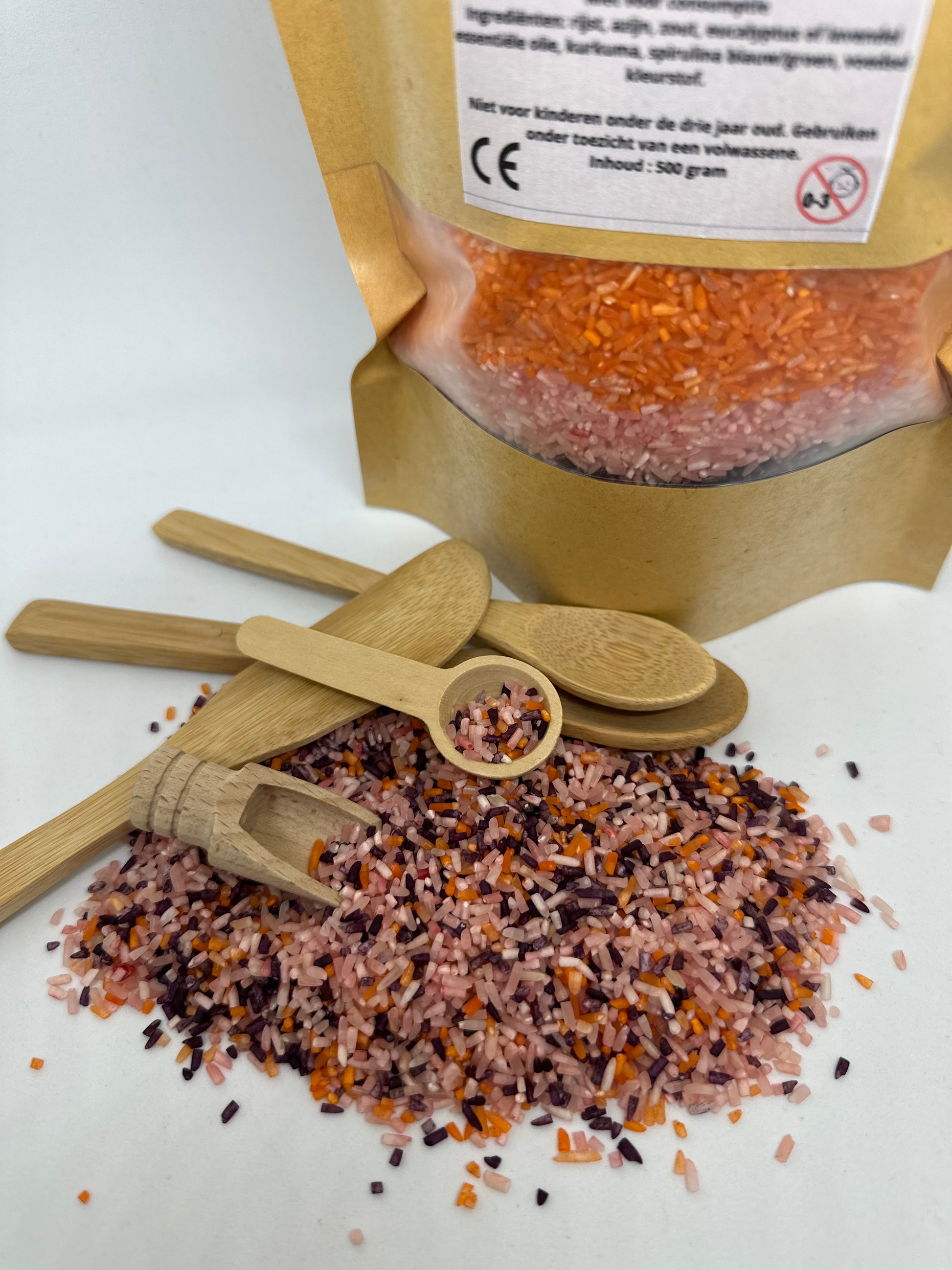 - Halve kilo natuurlijk gekleurde speelrijst met lavendel geur. Deze rijst is gekleurd met alles wat je in de natuur kan vinden, azijn, rode kool, spinazie, kurkuma, spirulina, bramen en paprika. Om het af te maken wordt de rijst bedruppeld met etherische lavendel olie om je kindje tijdens het spelen helemaal tot rust te brengen. Indien je rijst wenst zonder etherische olie moet je dit even hier vermelden. De rijst ruikt dat wel licht naar azijn vanwege het natuurlijke kleurproces.